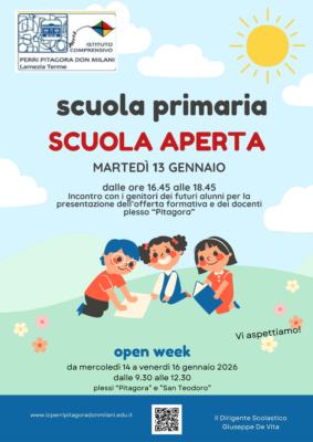 Per quanto concerne l’Open week, lo stesso sarà organizzato presso i plessi “Pitagora” e “San Teodoro” nella settimana da mercoledì 14/01/2026 a venerdì 16/01/2026.